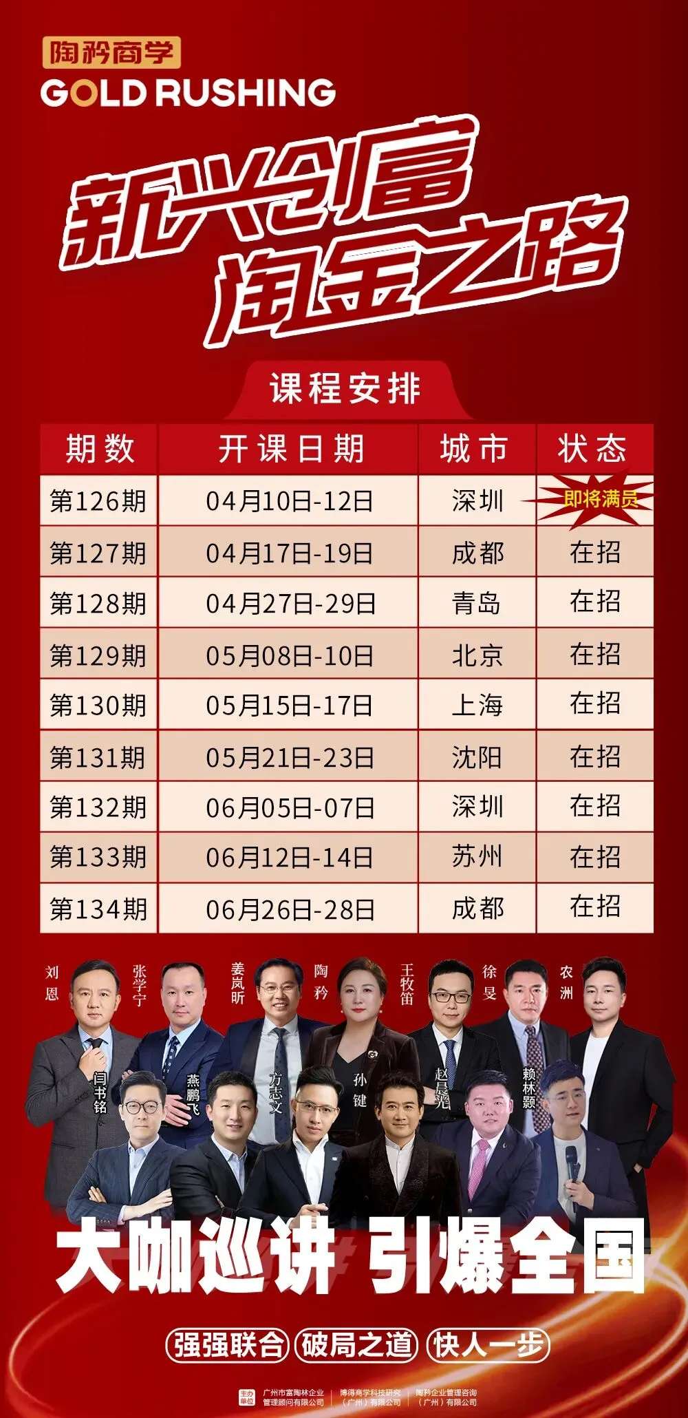 开年的选择,决定全年的高度。你是否还在为企业股权内耗、增长乏力、财富流转无门焦虑?别让 “开局迷茫” 拖慢一整年节奏!2026 年 4 月 10 日 - 12 日,陶矜商学《新兴创富・掘金之路》深圳重磅专场落地 —— 深圳澔悦格兰云天国际酒店,7 位顶流实战导师集结,以创富为起点、守富为保障、增富为手段、享富为目的、传富为归宿,叠加个人提升,一站式补齐企业经营、财富管理、个人成长短板,全年增长不跑偏!
