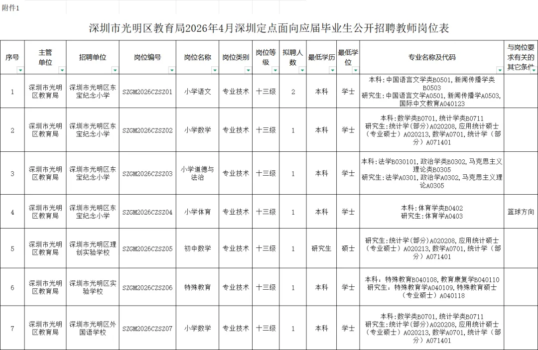 附件:1.深圳市光明区教育局2026年4月深圳定点面向应届毕业生公开招聘教师岗位表