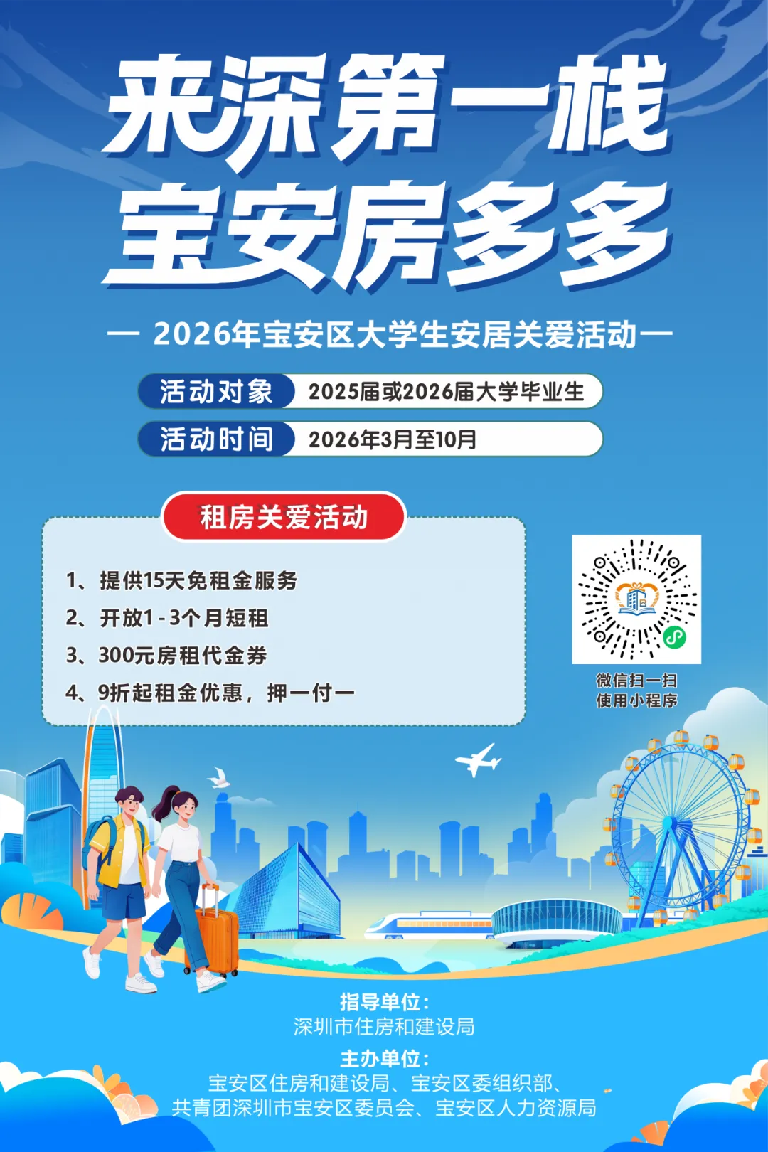 百万英才汇南粤,到宝安一起逐梦。向新而进的宝安,始终将安居宜居作为优化营商环境、激发创新活力的关键一环。不管是粤港澳大湾区(宝安)青年驿站从免费住宿7天延长到15天,提供创业导航、就业帮扶、城市融入和法律咨询等一站式落脚服务,还是宝安区“来深第一栈”大学生安居关爱活动为来深青年提供的15天免租金服务、1-3个月短期租赁服务、租金9折起、300元房租代金券等多重租房优惠,这些实实在在的租房福利,正在实现来深青年从“一张床”到“一套房”的转变,助力青年与城市“双向奔赴”。