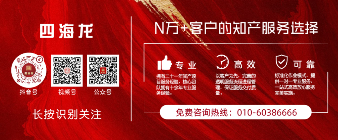 关注“四海龙知识产权”公众号,回复“案例”了解我司更多案例分享;回复“干货”及时了解知识产权布局相关知识!四海龙更多案例及干货知识,请关注获取吧!