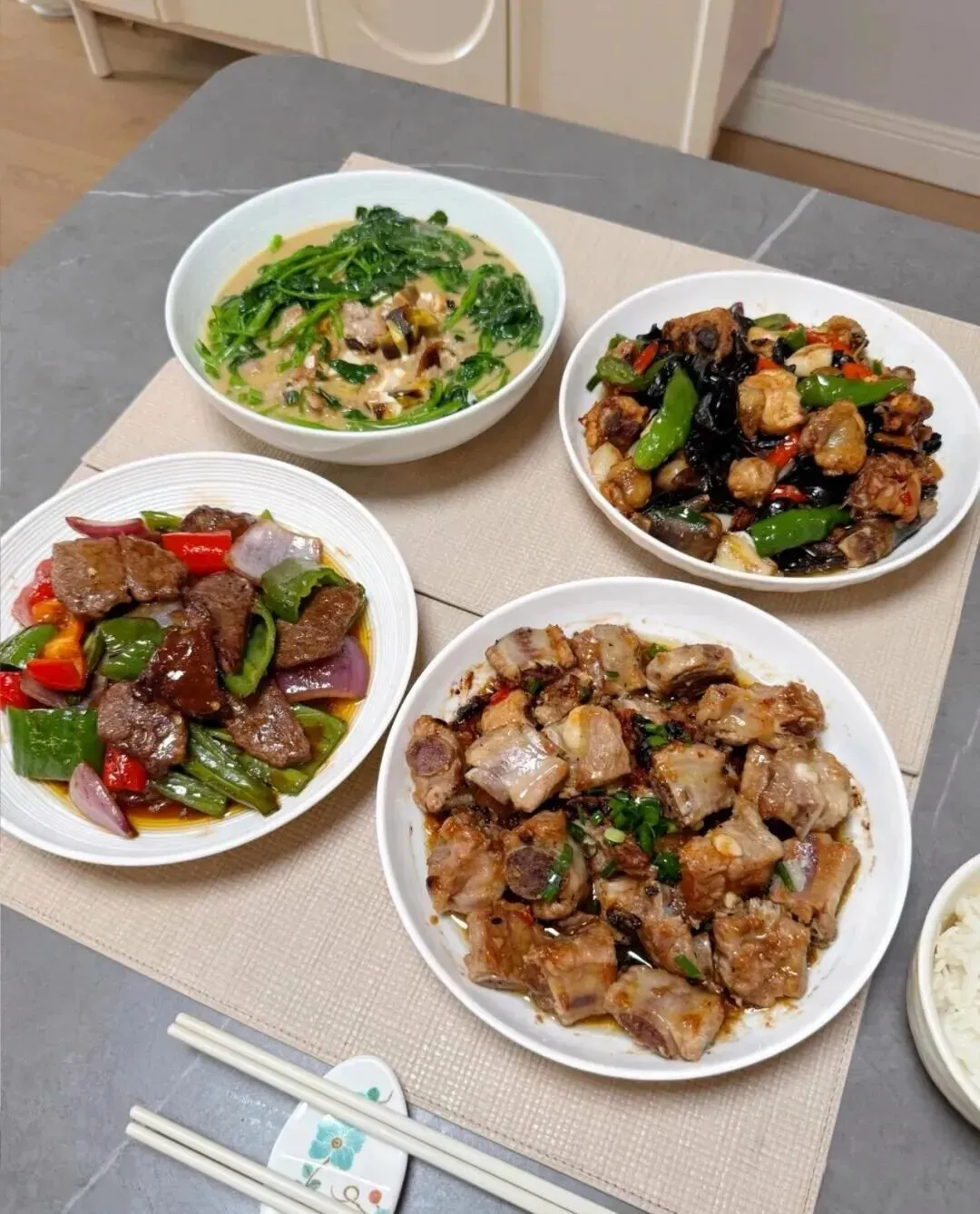 先看全桌,四个菜摆得满满当当,颜色压都压不住,红椒、青椒、紫洋葱、黑木耳、葱花,旁边还配着一碗白米饭。不是酒店那种精致摆盘,是很典型的“怕你吃不饱”的家里饭桌。