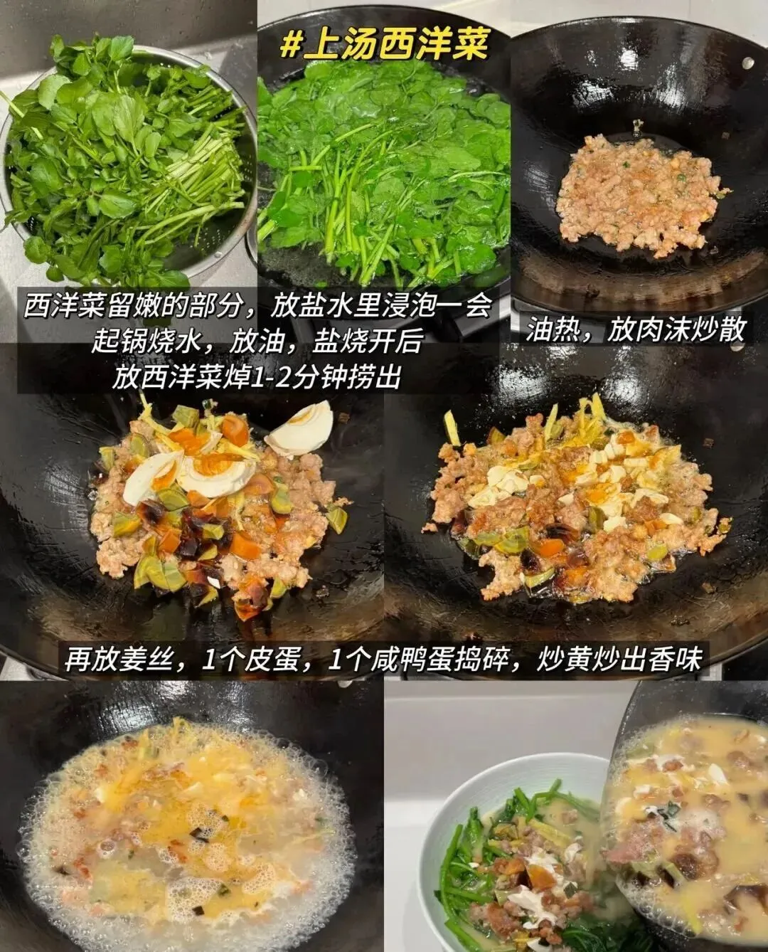 更有意思的是,连做法都被翻出来了。西洋菜先焯,肉末先炒,姜丝和双蛋下锅,最后再把汤淋回菜上。步骤不复杂,但每一步都透着认真。你会发现,很多妈妈做饭厉害,不在于多会创新,而在于她知道怎么把一口普通家常汤,做出“进门就有热气接住你”的感觉。