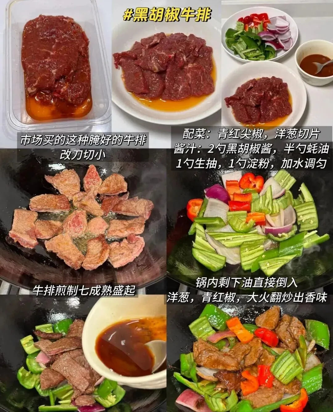 连教程都透着一种熟练:牛排提前腌好,煎到七成熟先盛起,锅里直接下配菜爆香,再回锅裹汁。家里人做饭,有个很明显的特征——她不只是想让你吃到,更想让你吃得舒服。