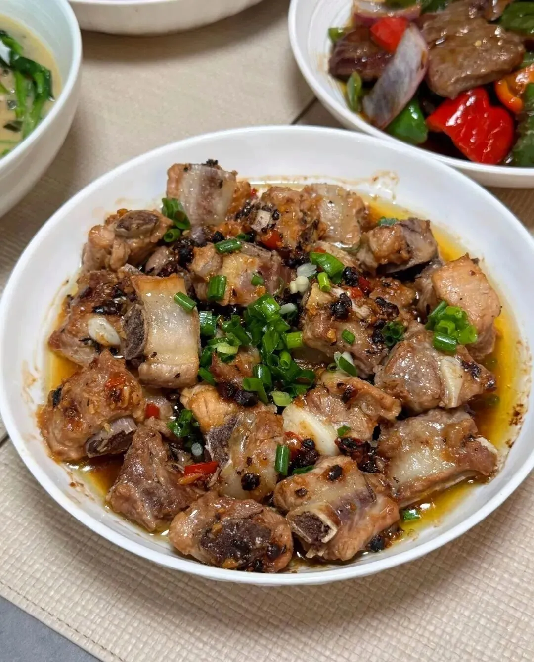 至于那盘排骨,油亮亮一层,豆豉和蒜末的香气像是隔着屏幕都能闻到。肉切得规整,骨边带着一点焦香,最后撒一把葱花,既压住了腻,也提了鲜。它不是那种清清淡淡、客客气气的菜,它很直接:今天这顿,得让你记住。