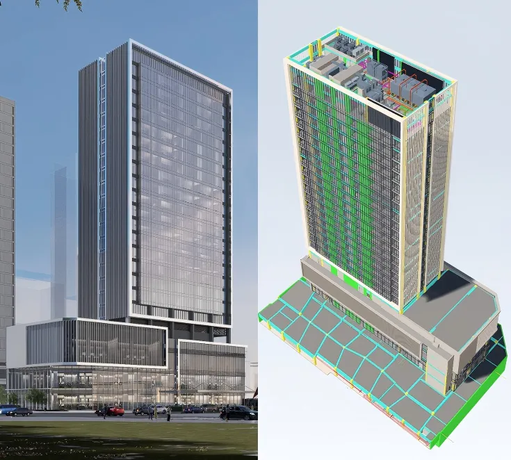 本项目借助广联达数维房建设计软件,进行BIM三维协同设计,全专业出图110张(建筑18张,结构25张,机电68张),出图率86.6%。