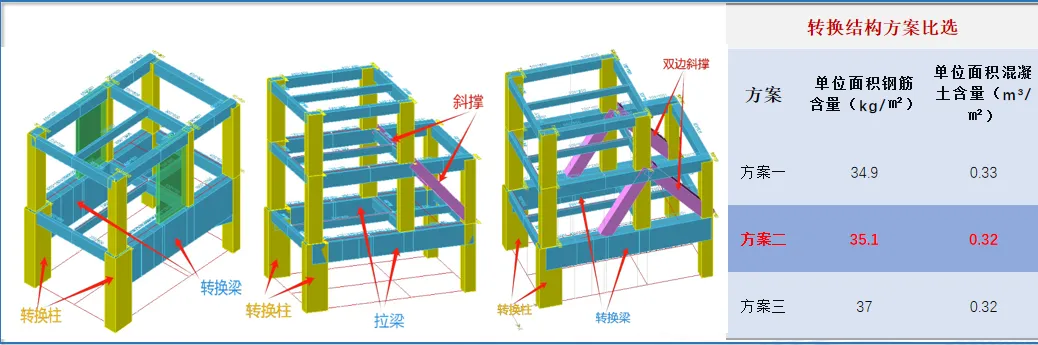 通过数维一体化的方式进行三个方案快速对比测算,可发现方案二在混凝土用量上具有明显优势,钢筋用量与原方案接近,且通过优化结构设计解决了原方案的传力模糊和净高不足问题,同时避免了方案三的高钢筋成本。综合材料经济性、结构安全性和功能实用性,最终将转换结构方案修改为方案二。