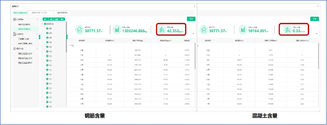 通过BIMQ云计算,可得出总量及钢筋含量及混凝土含量。本项目钢筋含量42kg/㎡(含基础)/混凝土含量0.33m³/㎡,满足业主限额要求。在设计过程中的限额计算,可及时发现限额设计达标,减少了传统设计中因限额不达标造成的返工,提升了设计效率,节省了企业成本。