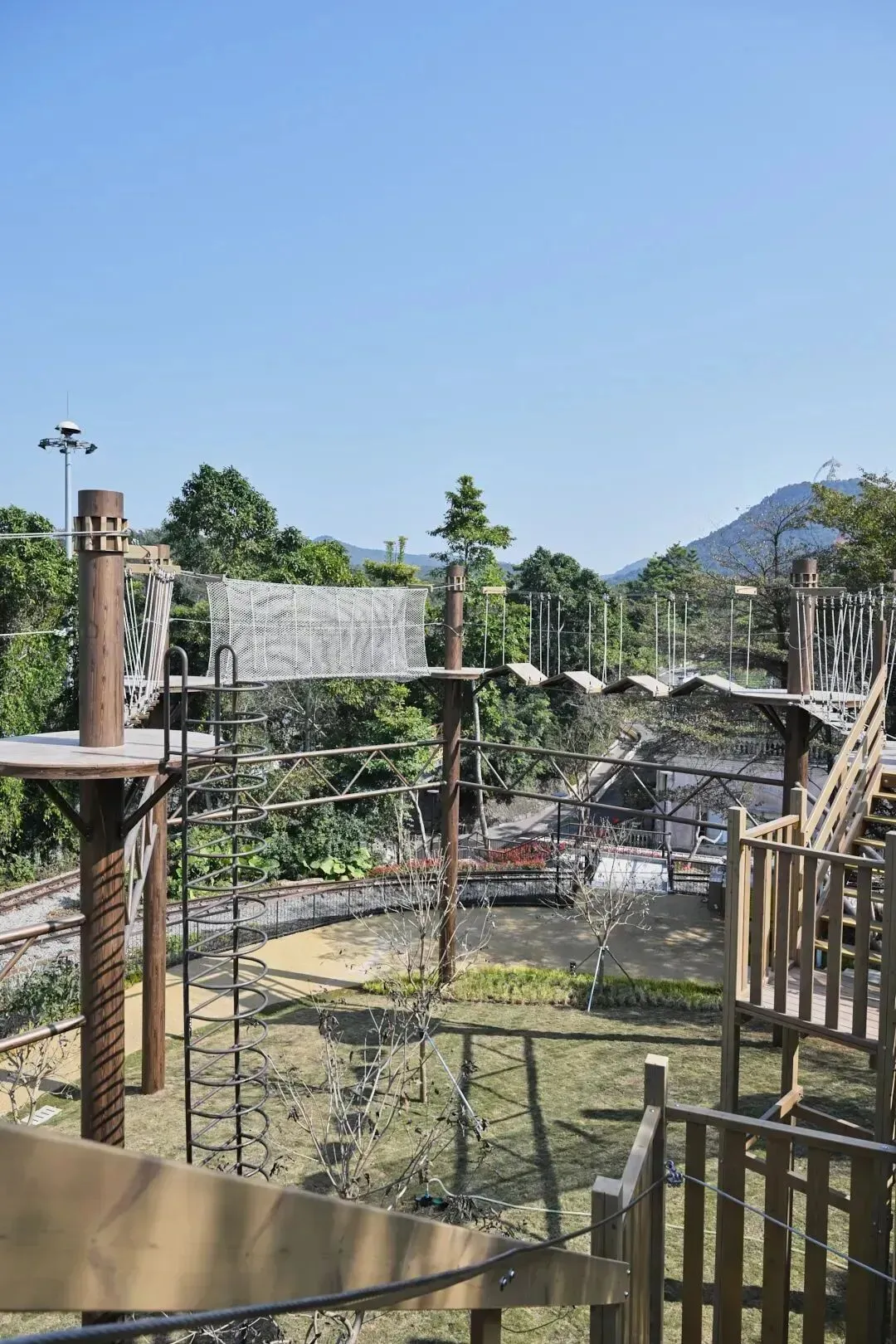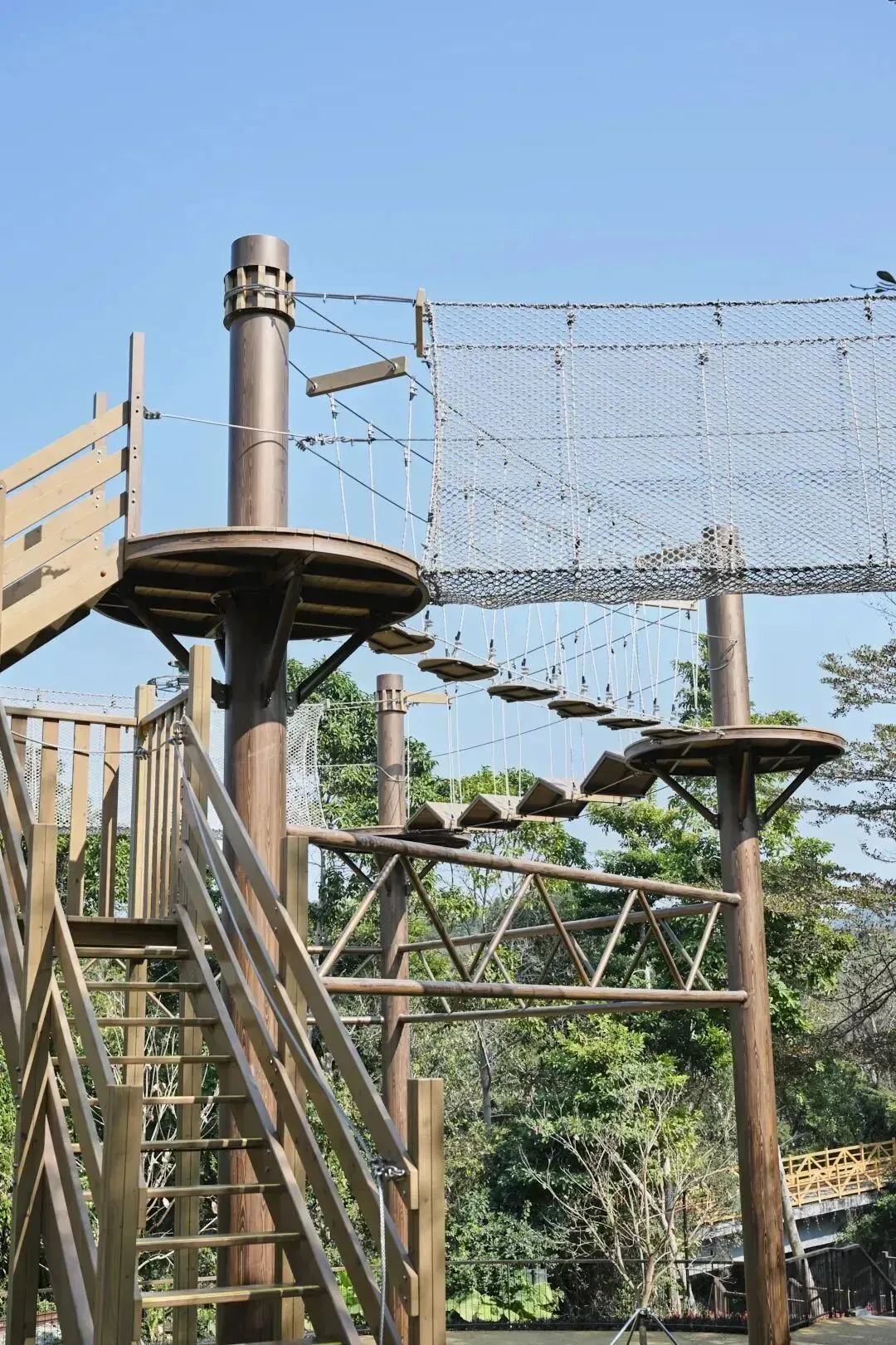 还有摇晃吊桥、狭窄平衡木、高难度攀爬网等,