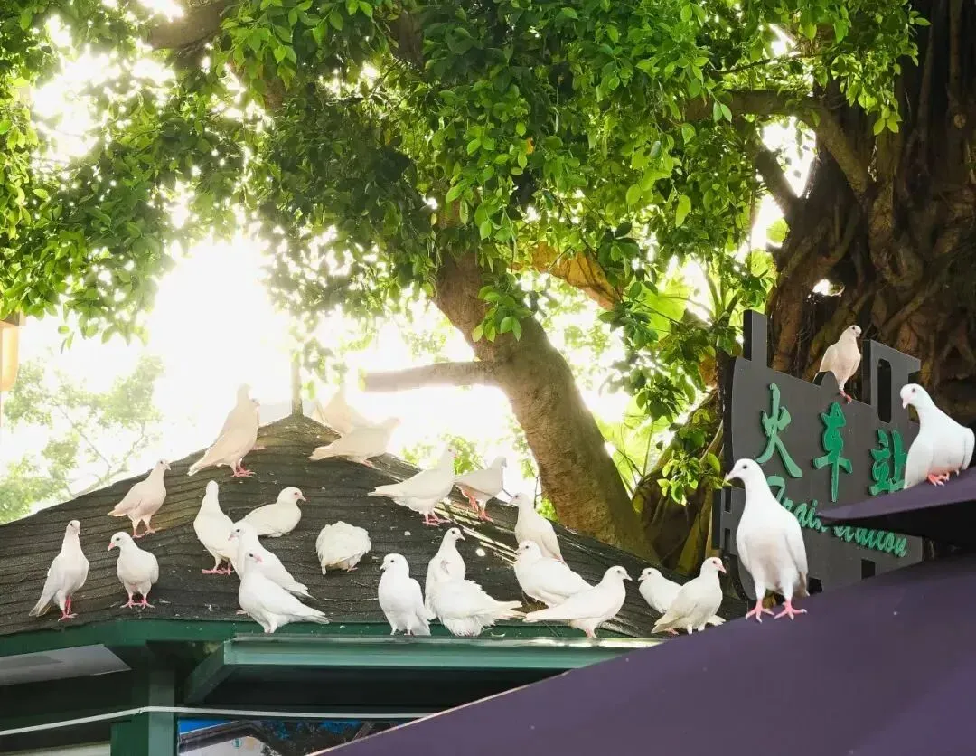 茶溪谷广场上成群的鸽子在木屋上盘旋,
