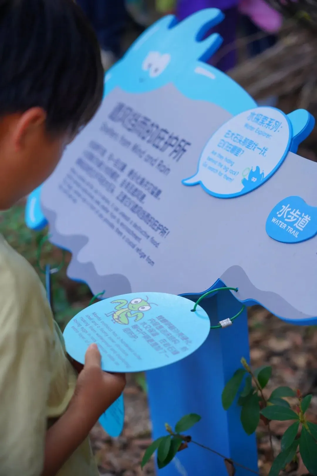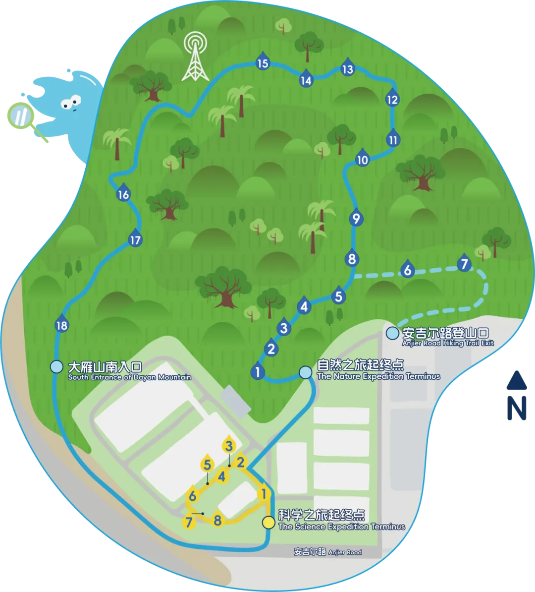 自然之旅大环线,全长约1公里,从安吉尔环境教育基地出发,延伸至大雁山山林,再回到基地。沿途修建了手作步道,并设置了18块自然科普解说牌。在这里,你可以看到水如何参与自然的每一个细节。