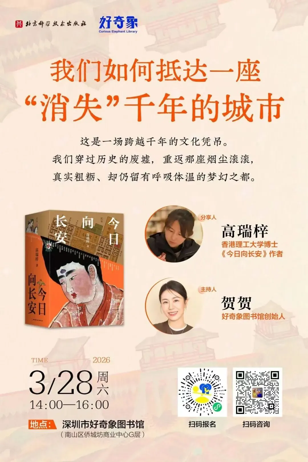 3月28日(本周六)下午,作家高瑞梓将来到好奇象图书馆,和好奇象图书馆创始人贺贺一起,带我们走进那座“真实、粗粝、有体温的长安城”。