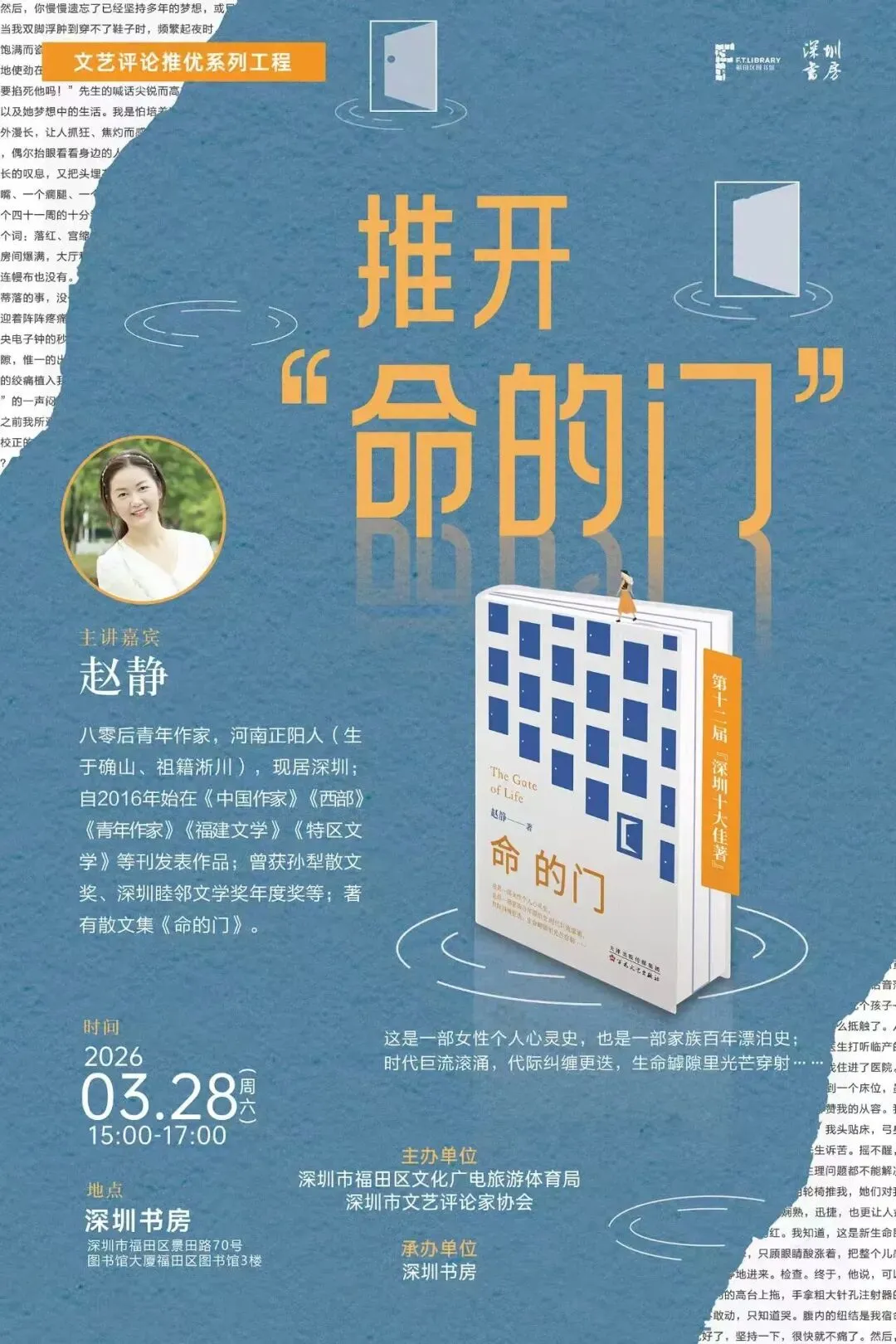 本次分享会嘉宾赵静,将带来其获评第十二届“深圳十大佳著”的散文集《命的门》,作品以细腻笔触书写女性个人心灵成长,回溯家族百年漂泊故事,在时代洪流中探寻生命的温度与归处。赵静将与读者分享创作初心、文本背后的家族记忆,以及如何在散文中捕捉生活的光亮与力量。