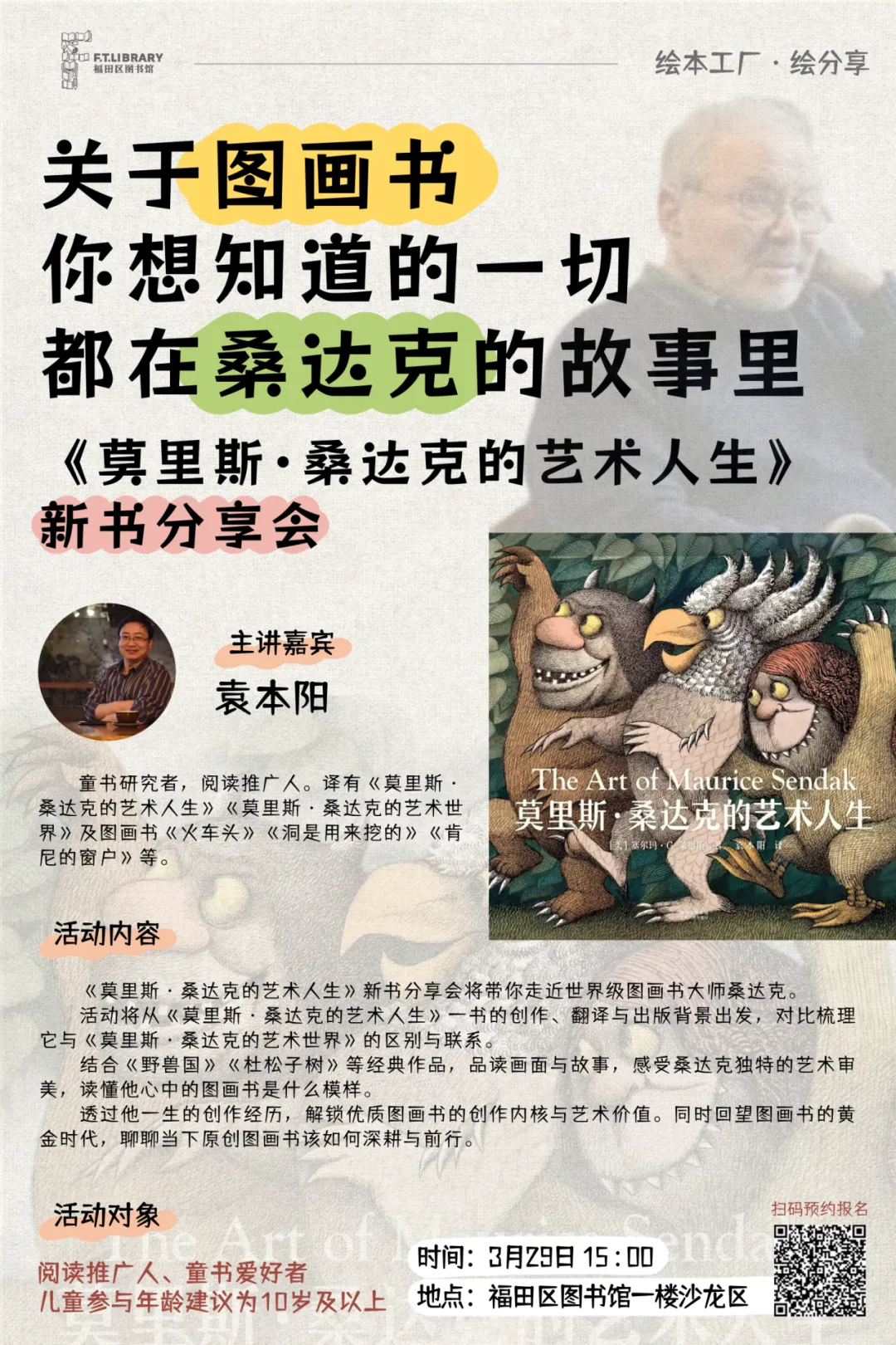 3月29日(本周日)下午关于桑达克艺术人生的“百科全书”《莫里斯·桑达克的艺术人生》中文版译者袁本阳将来到福田区图书馆带我们走进这位大师的内心世界感兴趣的大、小朋友赶快扫码报名吧!