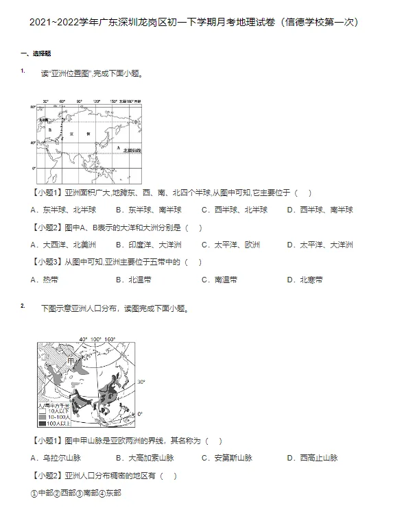 6套2019-2022学年深圳各区初一下学期月考政治地理历史真题及答案解析