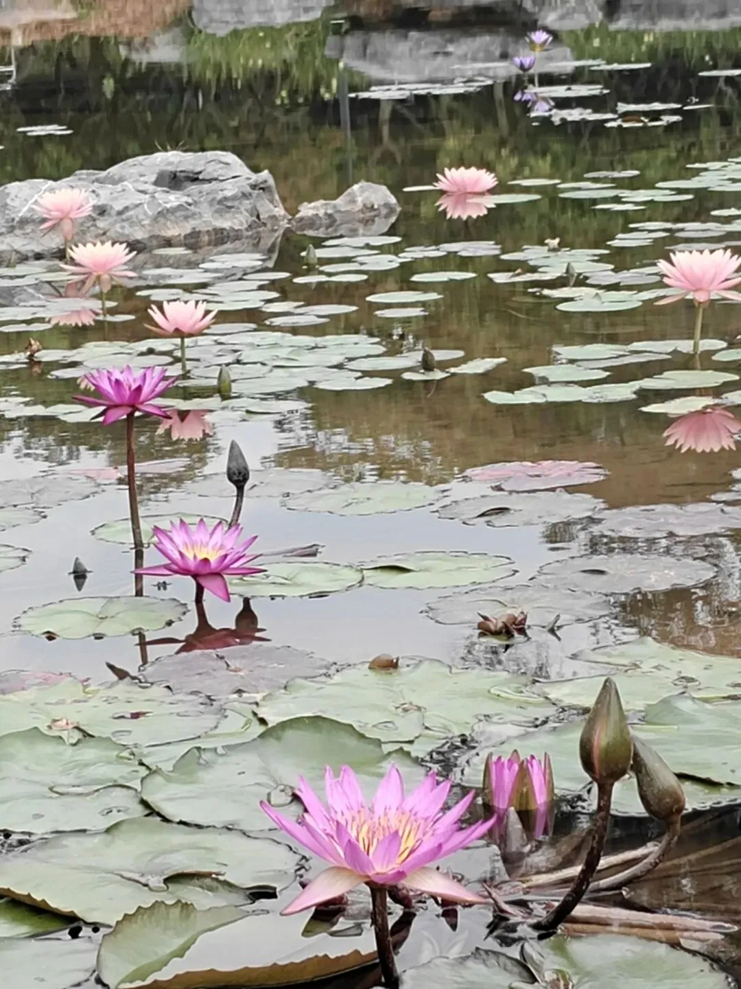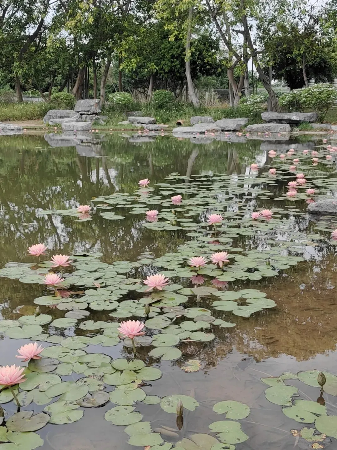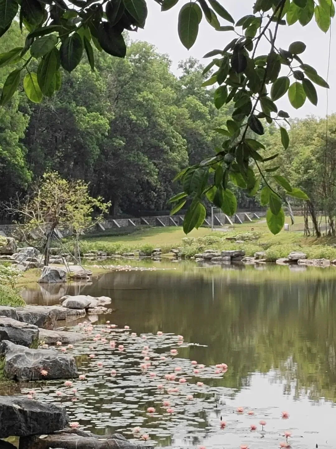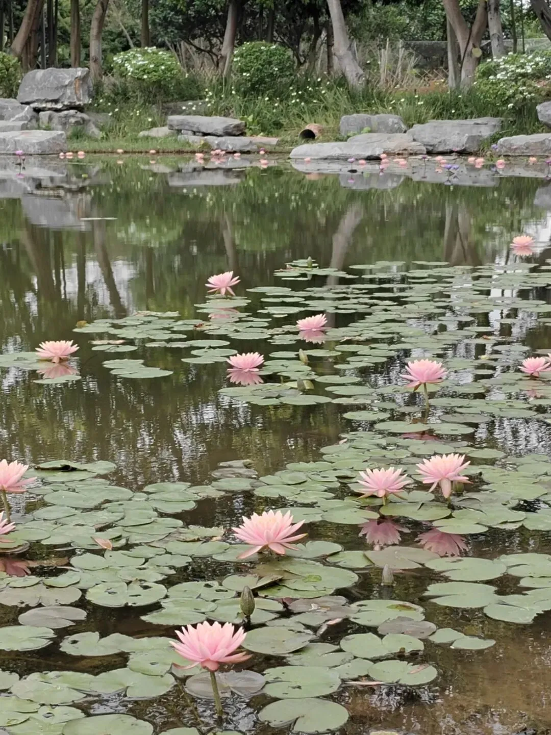 周未的深圳,都拥到笔架山体育公园观看2026粤港澳湾区花展、或到深圳湾公园看海鸥、或到梧桐山看毛棉杜鹃。想象得出人流量肯定很多,都围着花展上的各个景点在拍照,花景没看到多少,每个景点里里外外围着几层人在拍花。先让周未休息的市民游客先去欣赏,晚些时候安排好时间再去看花展、毛棉杜鹃。周未避开人山人海的地方,去环西丽湖绿道骑行。亲近大自然,放空身心。绿树成荫,一路畅通。环西丽湖绿道全程16.2公里生态绿道,它是围绕西丽湖水库而建,一路山景、湖景、溪水、荔枝林、花草🌿、儿童乐园为一体绿道。是市民游客周未节假日游玩、骑行、徒步的走近大自然的好地方。到了这片优静的园子,名曰“问山叠水”,映入眼帘的是这片莲花,一池如镜子般的湖水,湖面上点缀着盛开的睡莲。停下单车,静静欣赏这波光粼粼,荷叶相连于池畔,几片叶子层叠漂浮的薄水面,荷塘哇鸣,与涓涓清渠融为一体。喜欢这颜色的睡莲,清新可爱,艳而不娇。再搭配上这层层叠叠的莲叶,更是有一种超凡脱俗的美。拍摄机位:坐在湖边拍摄,或低机位拍摄莲花、湖景更出片。池塘边上还有其他时令花卉,正开着各种颜色的小花朵,有淡黄色、白色等颜色,构成一幅山林池畔的小清新景色。问山叠水的石头也是很特别,虽看似很随意叠放在荷塘畔的石块,也是点缀整个池塘的亮点之一。还有这荷塘旁或相连的树根、或根须植入土里长成粗壮根系支撑顶着树干,构造非常独特壮观,感叹大自然的鬼斧神工。这几天深圳早晚温差大,中午阳光明媚,建议一般上午11点前,下午3点以后骑行、徒步。阳光柔和拍照效果更好。✅推荐服饰:建议穿搭浅色系衣服,衣服以舒适运动服比较合适。✅推荐鞋子:建议尽量穿平底鞋、小白鞋,运动鞋,低跟鞋。拒绝穿高跟鞋。✅防晒装备:深圳最近艳阳高照,出行记得防晒。如防晒霜,防晒帽,防晒衣、太阳镜、防蚊等等。✅另外也可带适量饮用水、适当食物补充体力。虽然各个景点也有售卖,但有时在半道骑行,以备不时之需。✅注意安全:骑行、徒步注意安全,陡峭坡道注意放慢速度,安全第一!交通: