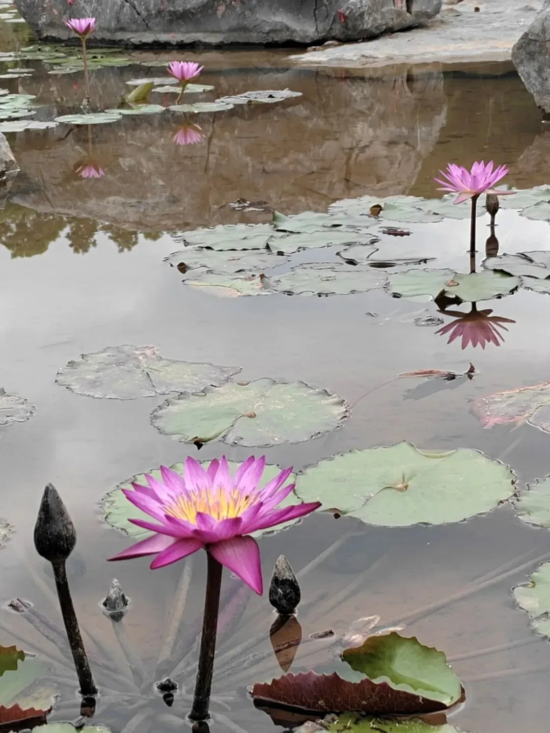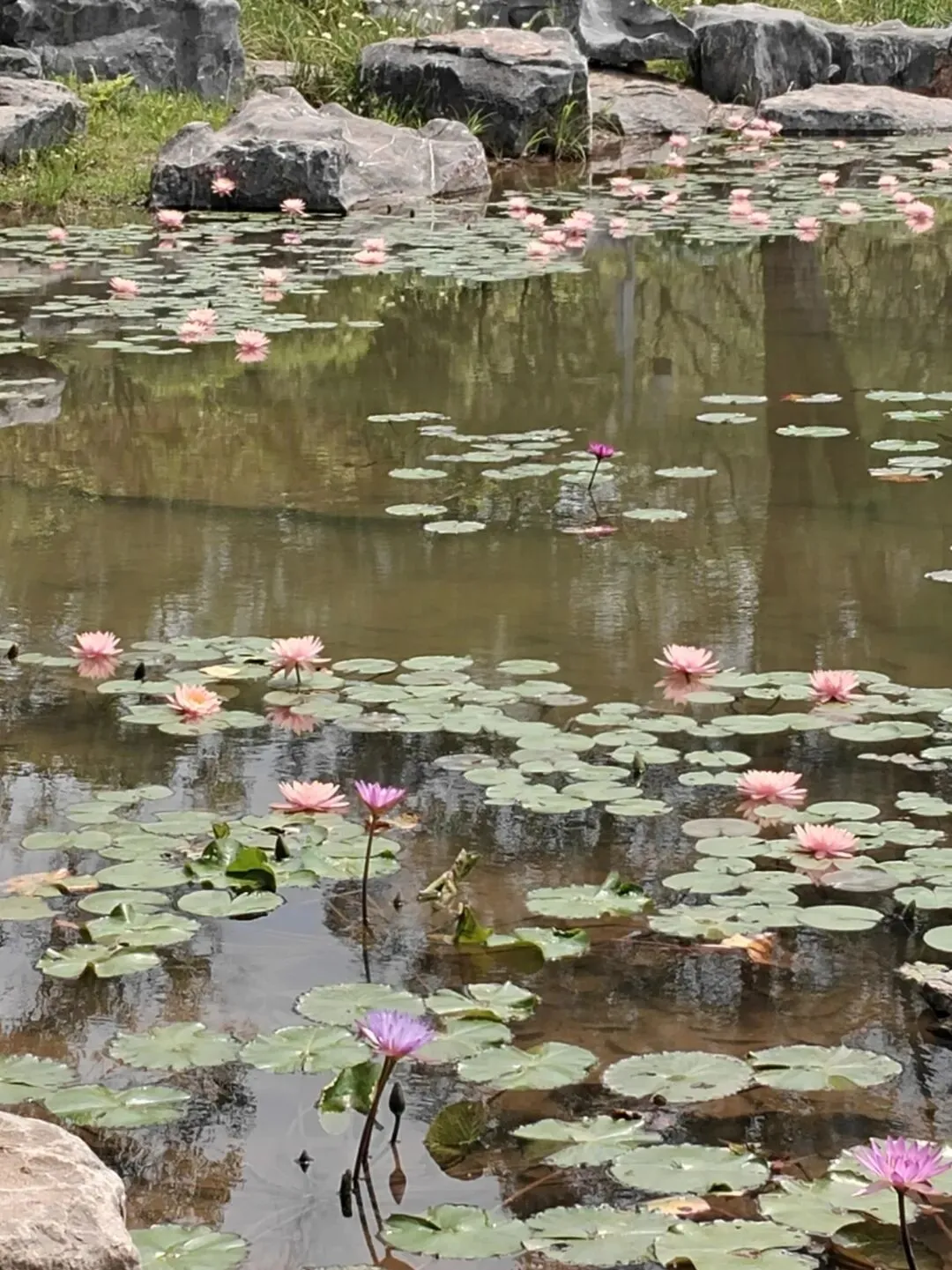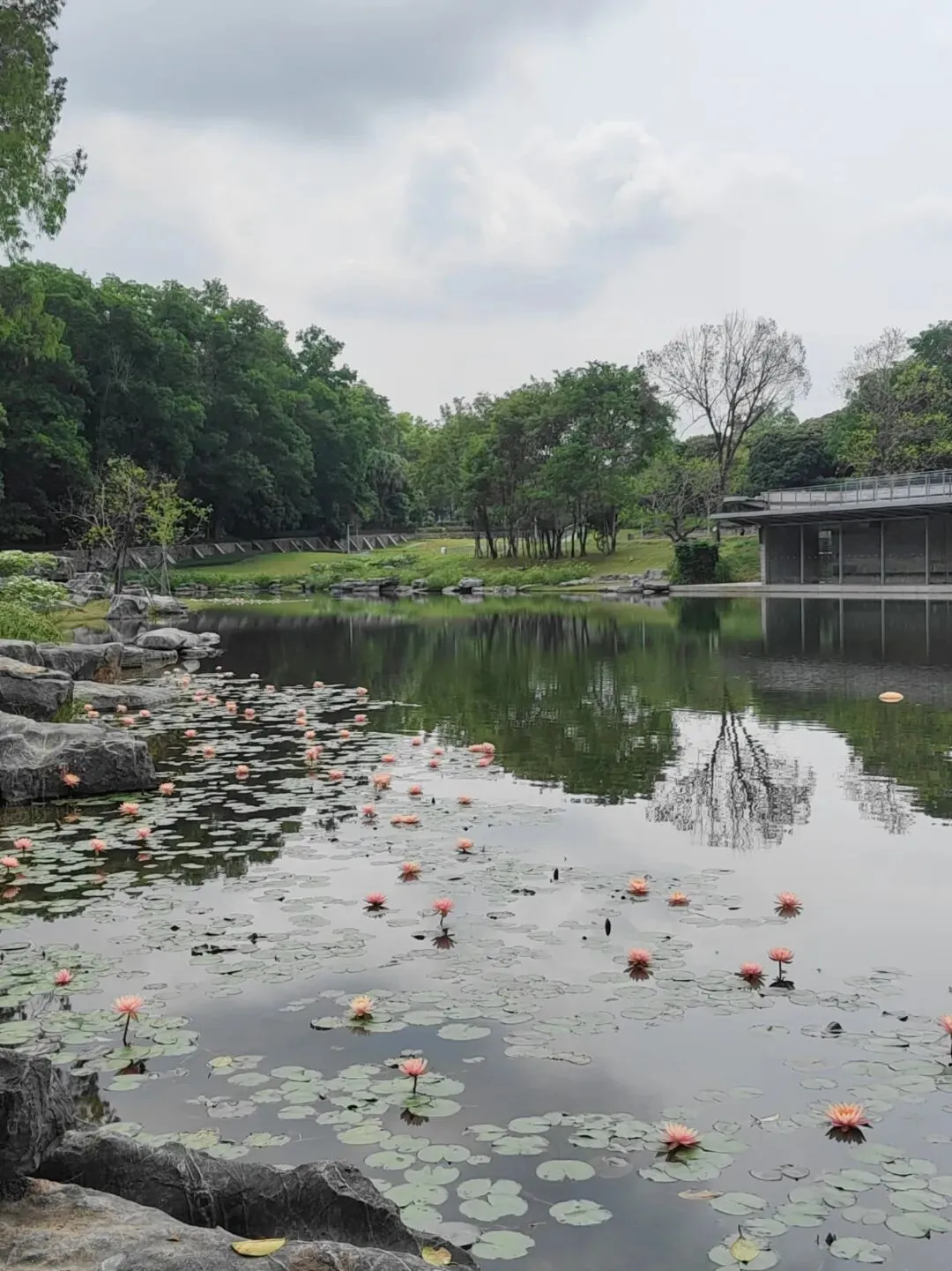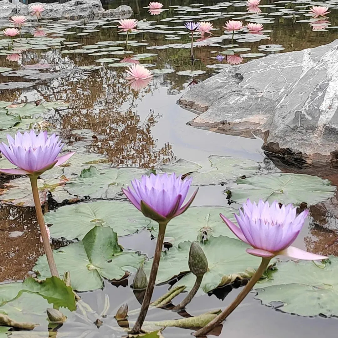 周未的深圳,都拥到笔架山体育公园观看2026粤港澳湾区花展、或到深圳湾公园看海鸥、或到梧桐山看毛棉杜鹃。想象得出人流量肯定很多,都围着花展上的各个景点在拍照,花景没看到多少,每个景点里里外外围着几层人在拍花。先让周未休息的市民游客先去欣赏,晚些时候安排好时间再去看花展、毛棉杜鹃。周未避开人山人海的地方,去环西丽湖绿道骑行。亲近大自然,放空身心。绿树成荫,一路畅通。环西丽湖绿道全程16.2公里生态绿道,它是围绕西丽湖水库而建,一路山景、湖景、溪水、荔枝林、花草🌿、儿童乐园为一体绿道。是市民游客周未节假日游玩、骑行、徒步的走近大自然的好地方。到了这片优静的园子,名曰“问山叠水”,映入眼帘的是这片莲花,一池如镜子般的湖水,湖面上点缀着盛开的睡莲。停下单车,静静欣赏这波光粼粼,荷叶相连于池畔,几片叶子层叠漂浮的薄水面,荷塘哇鸣,与涓涓清渠融为一体。喜欢这颜色的睡莲,清新可爱,艳而不娇。再搭配上这层层叠叠的莲叶,更是有一种超凡脱俗的美。拍摄机位:坐在湖边拍摄,或低机位拍摄莲花、湖景更出片。池塘边上还有其他时令花卉,正开着各种颜色的小花朵,有淡黄色、白色等颜色,构成一幅山林池畔的小清新景色。问山叠水的石头也是很特别,虽看似很随意叠放在荷塘畔的石块,也是点缀整个池塘的亮点之一。还有这荷塘旁或相连的树根、或根须植入土里长成粗壮根系支撑顶着树干,构造非常独特壮观,感叹大自然的鬼斧神工。这几天深圳早晚温差大,中午阳光明媚,建议一般上午11点前,下午3点以后骑行、徒步。阳光柔和拍照效果更好。✅推荐服饰:建议穿搭浅色系衣服,衣服以舒适运动服比较合适。✅推荐鞋子:建议尽量穿平底鞋、小白鞋,运动鞋,低跟鞋。拒绝穿高跟鞋。✅防晒装备:深圳最近艳阳高照,出行记得防晒。如防晒霜,防晒帽,防晒衣、太阳镜、防蚊等等。✅另外也可带适量饮用水、适当食物补充体力。虽然各个景点也有售卖,但有时在半道骑行,以备不时之需。✅注意安全:骑行、徒步注意安全,陡峭坡道注意放慢速度,安全第一!交通:
