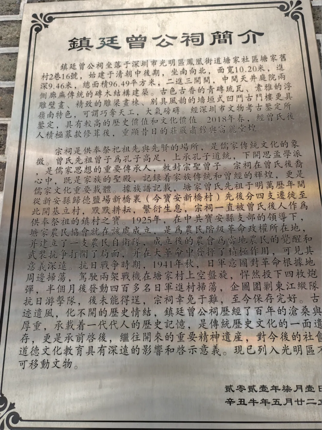 镇廷曾公祠,朝北。在古村前右端。建于清朝。水塘即祠前隔一栋楼。塘家曾氏于万历间由归德场新桥里先后分四支迁来。祠右首稍靠后两米芝兰书室。
