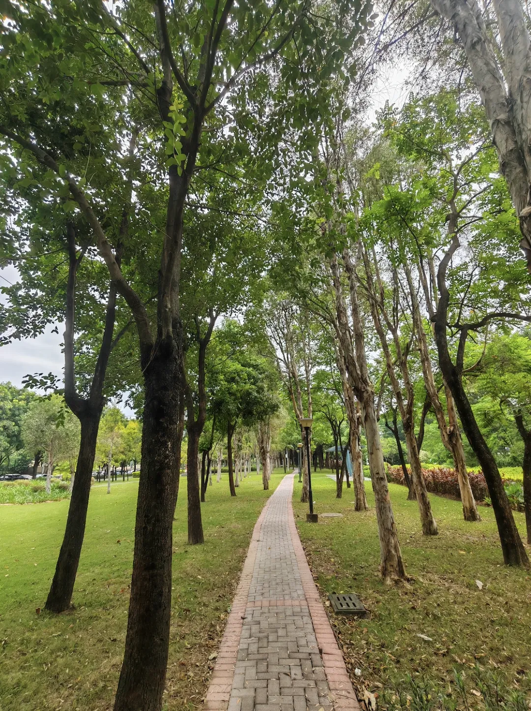 祠在低处,村往后上。一直上到新村之台,东面更高一些。老村东面有荔园,桥洞穿龙大高速,3号和懋桥洞。过去是凤举路。龙大高速略有抬高,其路东,从塘家开始,一直有一个50米宽的树林绿化带,到周家大道。绿植整理养护优美,为带状公园。