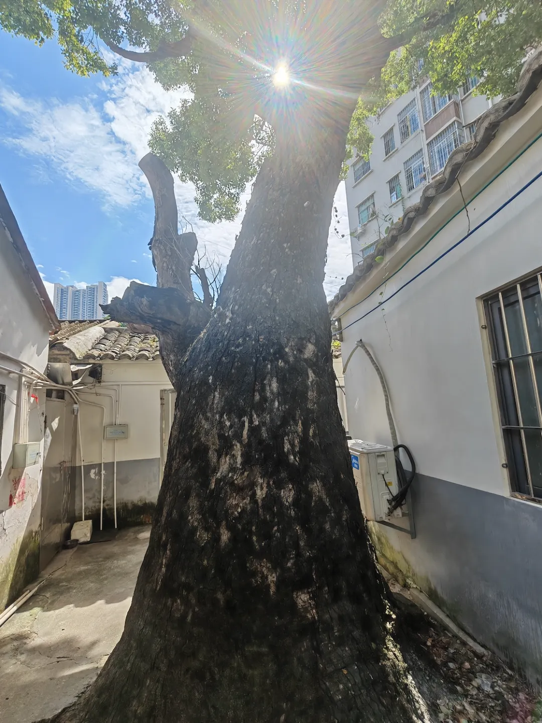 由张屋过洞来东北直上牛山有大道是光源五路。所以,张屋距中心很近。再看张屋旧村。有张屋围门。有东围门西围门,大树在西围门。给大树拍照又照见太阳。听说最近太阳黑子大爆发。