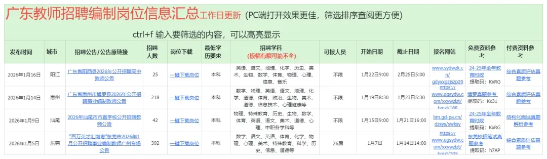 备考广东教招的宝子别蹲官网刷到眼瞎 —— 这份广东教师编制招聘汇总表直接把全年公告喂到你手里!