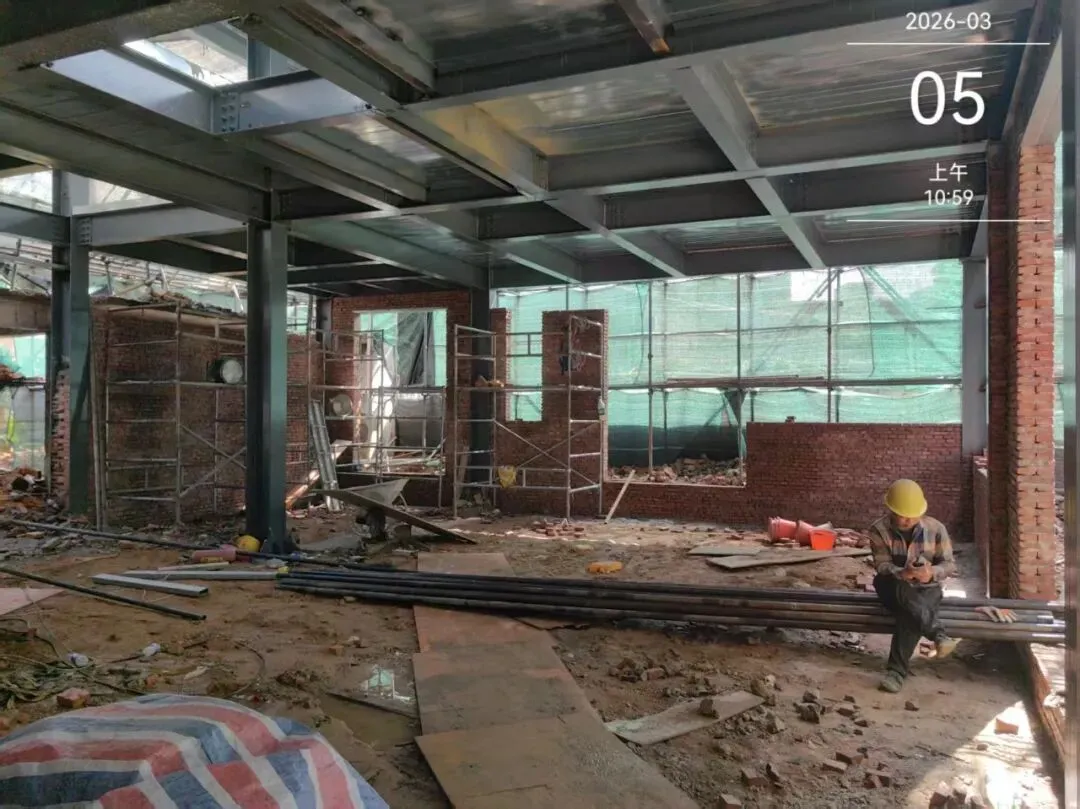 钢结构框架已安装,现场师傅在墙体施工当中。。。