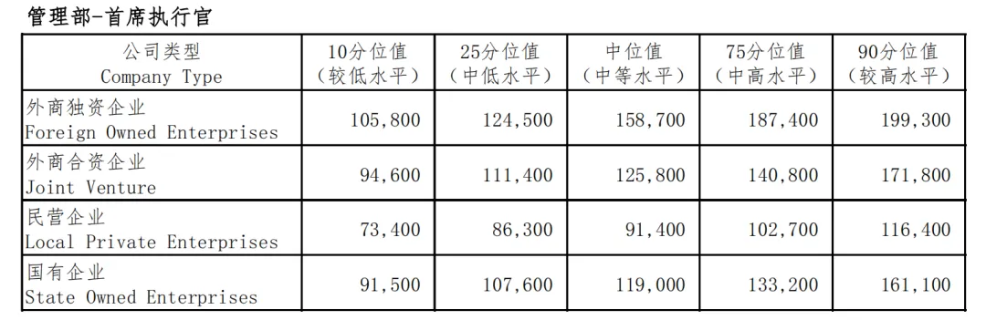 其次是外商合资企业(如西门子(深圳)磁共振有限公司、盐田国际集装箱码头有限公司等企业),其首席执行官月薪最高为17.1万元,最低近9.5万元,年薪也超百万了。从分布来看,25分位值对应的月薪为11.1万,中位值为12.6万,75分位值对应月薪为14万。合资企业的待遇相对外商独资来说,确实要低一些,但是也处于较高的水平。
