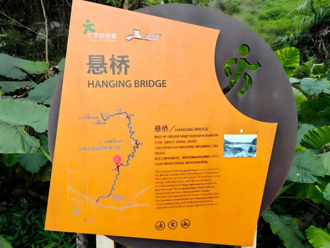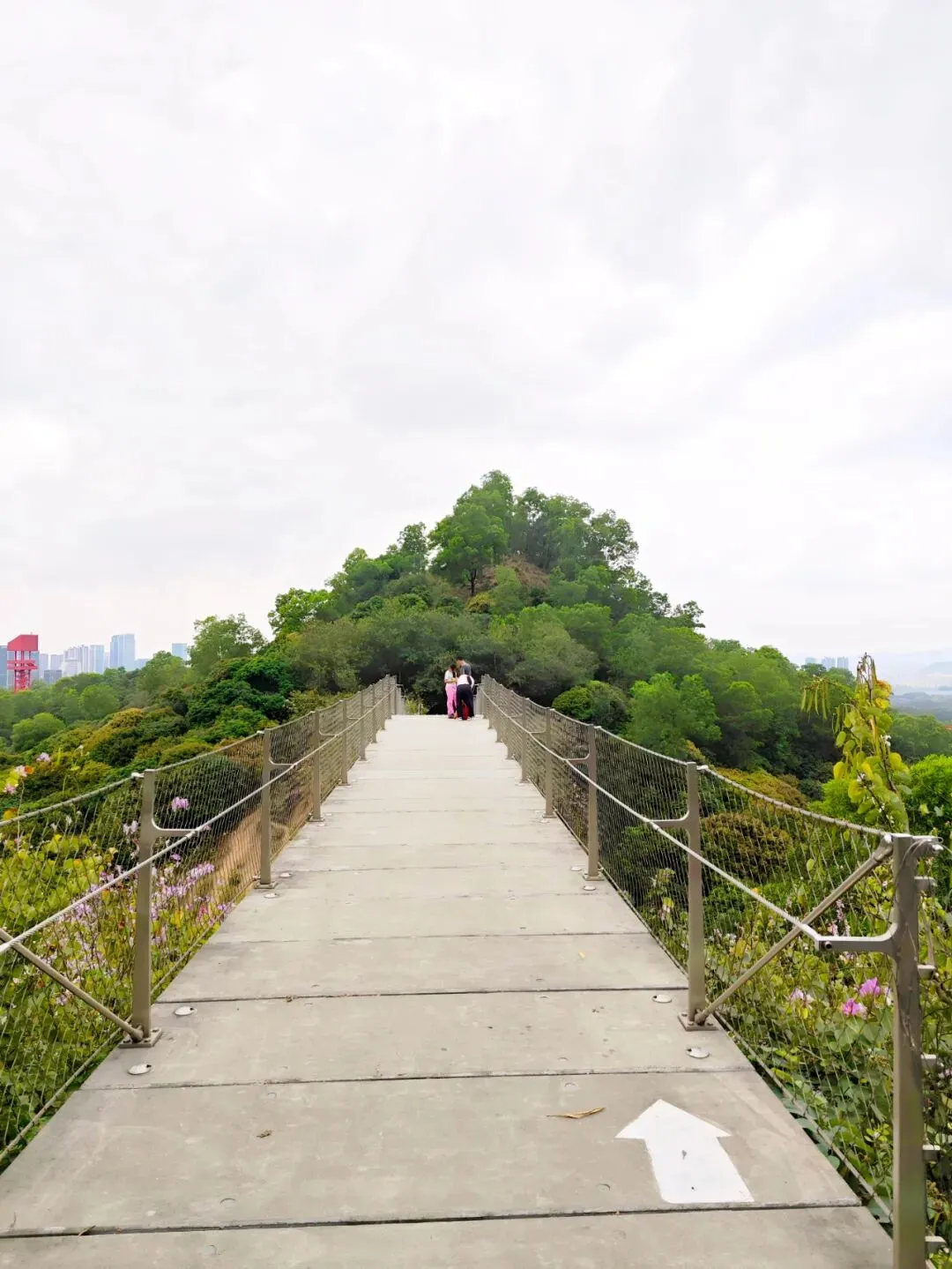 悬桥横跨山谷,全长 90 米,桥面距谷底约 30 米,走在上面能感受到桥体的轻微脉动,风吹过的时候,仿佛在山林间「荡秋千」,还能远眺虹桥和光明城区,视野超绝!