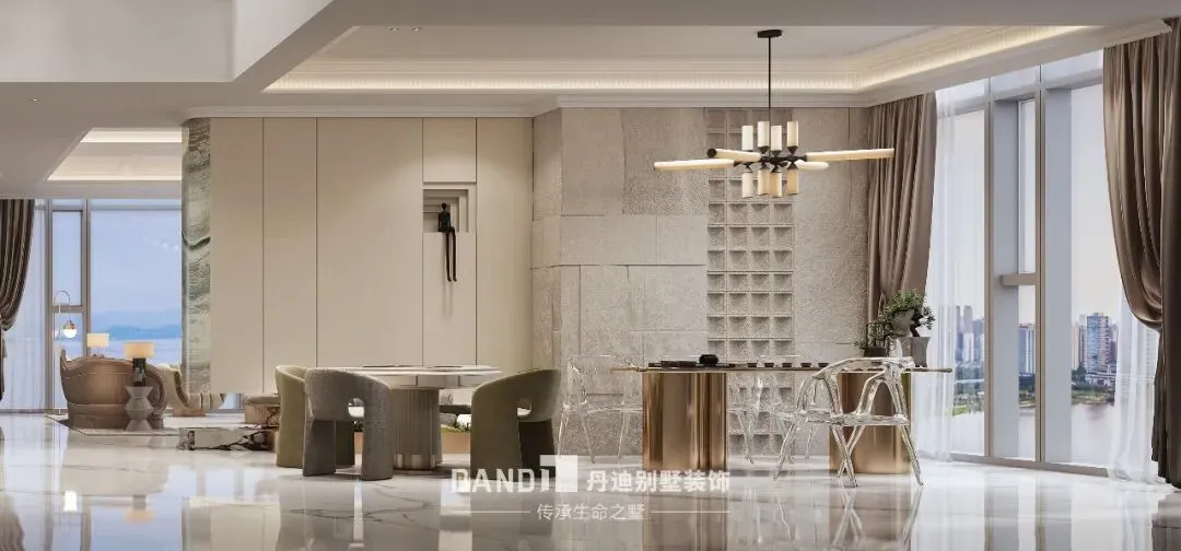 整体空间设计遵循“分层而居,各得其所”的理念,打造动静分明、功能完善的居住格局,兼顾社交排场与私密生活。一层规划为开放式公共社交区,挑高客厅搭配全景落地窗,将海景与空间尺度拉满,成为居者会客、聚会的核心场域,客餐厨一体化设计让动线更流畅,既满足高端社交的体面需求,又能承载家人日常互动的温暖。