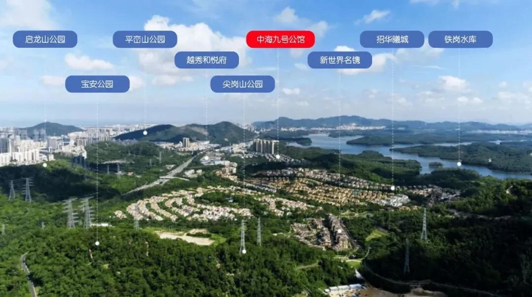 中海·九号公馆位于宝安尖岗山,周边被六山两水三公园环绕,生态资源丰富。地处尖岗山地势蜿蜒起伏成龙脉,背倚深圳最大的饮用水水库铁岗水库,整体格局“上风上水”风水极佳。