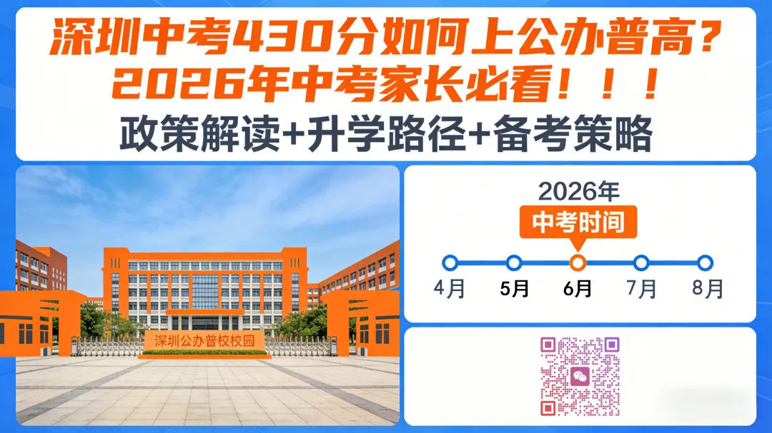 孩子中考预估 430 分,离公办普高线还有差距,是不是就没希望了?别慌!430 分≠与公办普高无缘,2026 年深圳中考有官方降分通道、志愿填报技巧、分数冲刺策略,帮孩子抓住上公办普高的机会,低分也能逆袭!一、先看清:430 分的真实处境