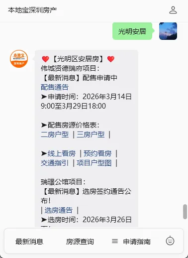 点击下方关注【本地宝深圳房产】公众号,输入【光明安居】关键词,即可获取光明区安居房最新消息、配售通告、看房入口、看房指引等