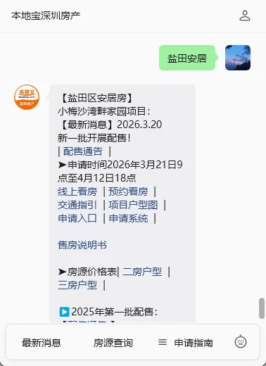点击下方关注【本地宝深圳房产】公众号,输入【盐田安居】关键词,即可获取盐田区安居房最新消息、配售通告、看房入口、看房指引等