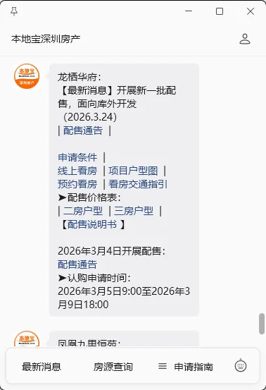 点击下方关注【本地宝深圳房产】公众号,输入【龙岗安居】关键词,即可获取龙岗区安居房龙栖华府、看房入口、看房指引等