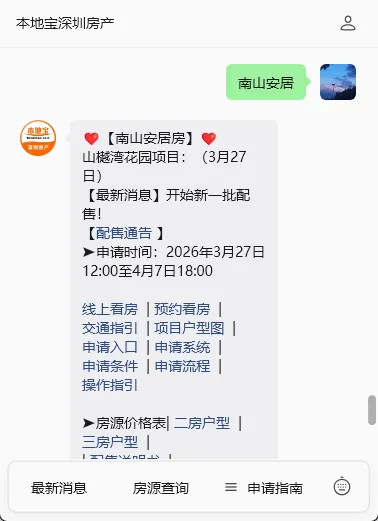 点击下方关注【本地宝深圳房产】公众号,输入【南山安居】关键词,即可获取南山区安居房最新消息、配售通告、申请入口、看房入口等