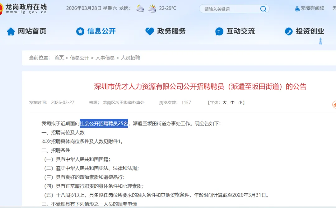 深圳市优才人力资源有限公司公开招聘聘员(派遣至坂田街道)的公告