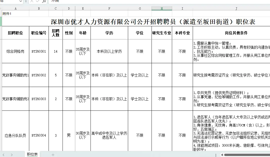 - 附件1:深圳市优才人力资源有限公司公开招聘聘员(派遣至坂田街道)职位表.xls