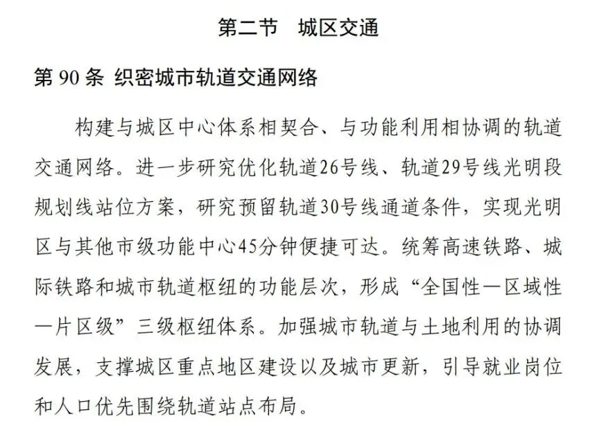 近日,《深圳市光明区国土空间分区规划(2021—2035年)》(以下称“规划”)已经深圳市政府批复同意,深圳市规划和自然资源局、深圳市光明区人民政府发布公示。“规划”中提到,构建与城区中心体系相契合、与功能利用相协调的轨道交通网络。进一步研究优化轨道26号线、轨道29号线光明段规划线站位方案,研究预留轨道30号线通道条件,实现光明区与其他市级功能中心45分钟便捷可达。