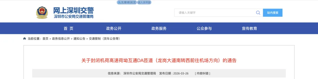 一、2026年4月1日0时至2028年10月30日24时,封闭机荷高速荷坳互通DA匝道(龙岗大道南转西前往机场方向)入口,封闭期间所有车辆将不能通过荷坳收费站去往机场方向,原经荷坳收费站往机场方向的车辆,可沿龙岗大道北行至爱南路掉头口后通过机荷高速荷坳互通北转西匝道前往或绕行水官高速。
