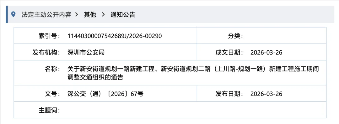 一、2026年3月27日至2026年3月30日期间,1时至6时,临时封闭皇岗路主道南行方向(福喜五街段)道路进行施工,原经此路段通行的车辆,可改由皇岗路辅道、福港路或周边其他道路通行。