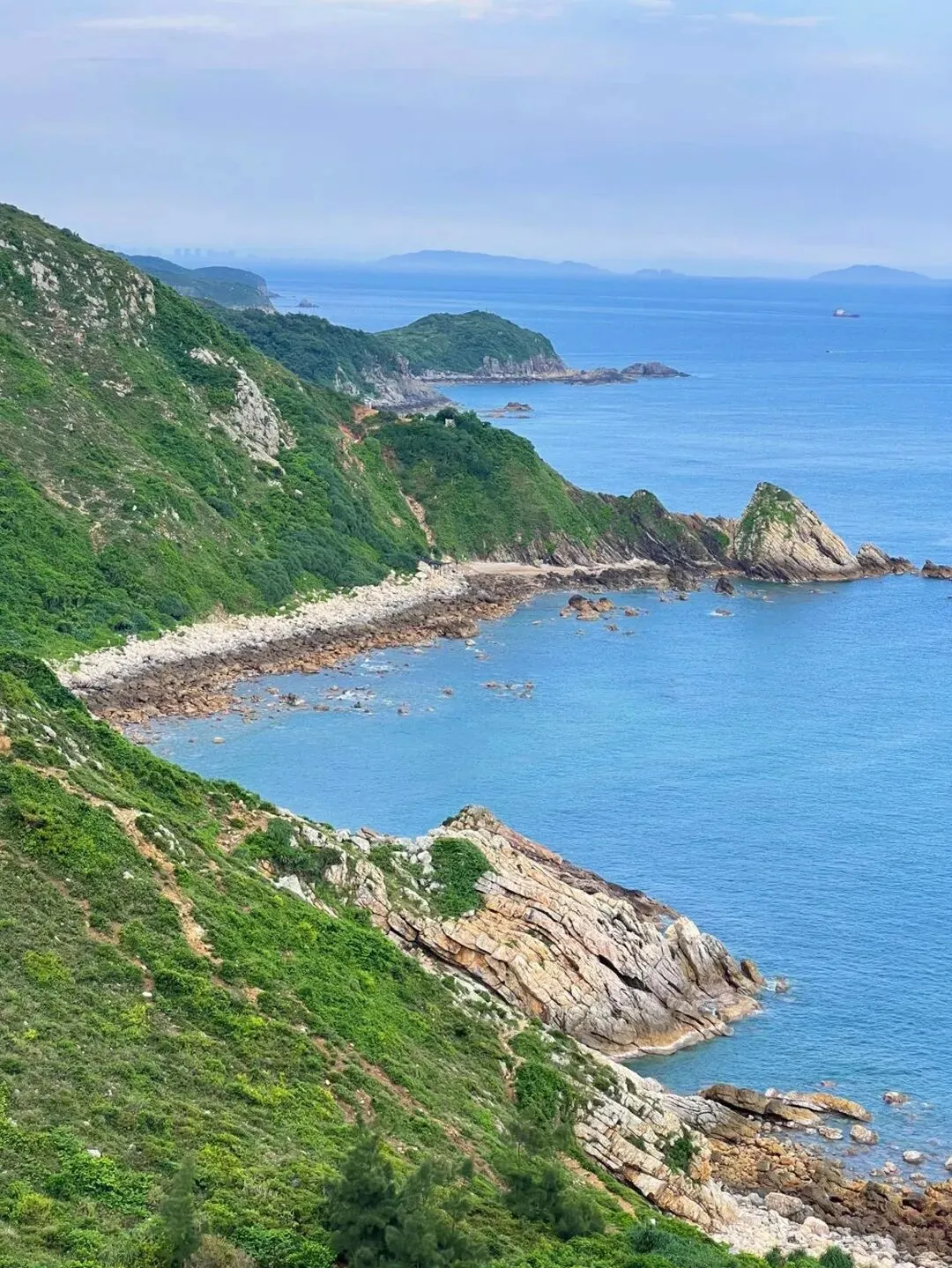 爬过陡峭的礁石坡,转头撞见蔚蓝的海平面铺展开来,白色的浪花一遍遍亲吻海岸,连汗水都带着海风的清甜。