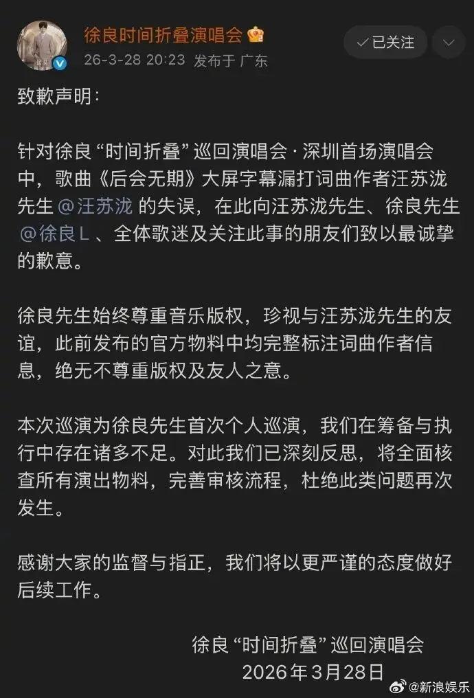为此,演唱会官博发文向汪苏泷、徐良、全体歌迷及关注此事的所有人道歉,并承诺后续将全面核查所有演出物料,完善审核流程,杜绝此类问题再次发生。
