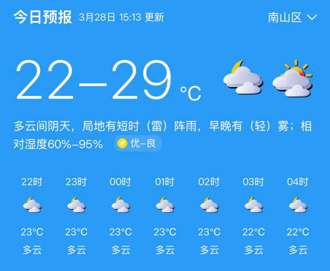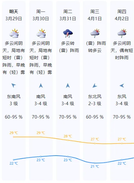 预计29日-30日大致多云,早晚有(轻)雾,间中局地有短时(雷)阵雨,29日气温22℃-29℃。