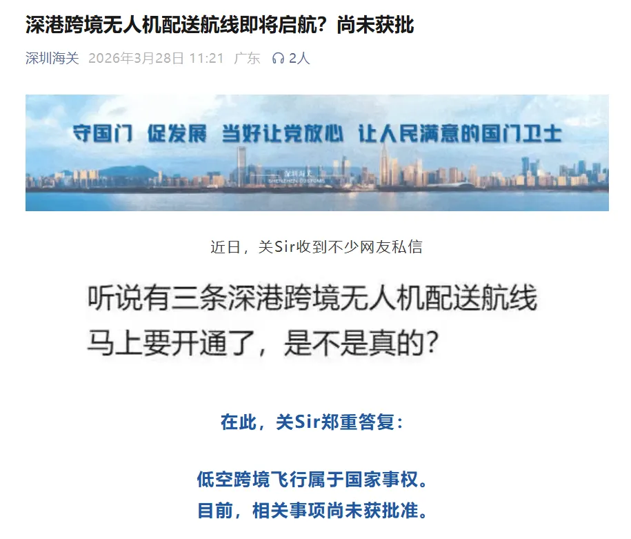 据称,近日,深圳海关收到不少网友私信询问称,“听说有三条深港跨境无人机配送航线马上要开通了,是不是真的”?对此,深圳海关郑重答复:
