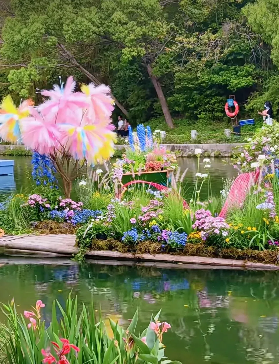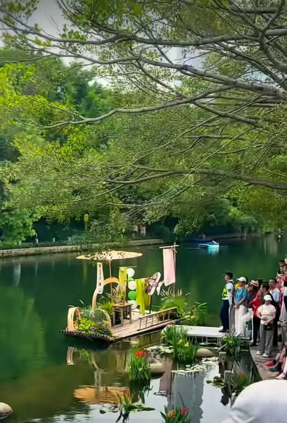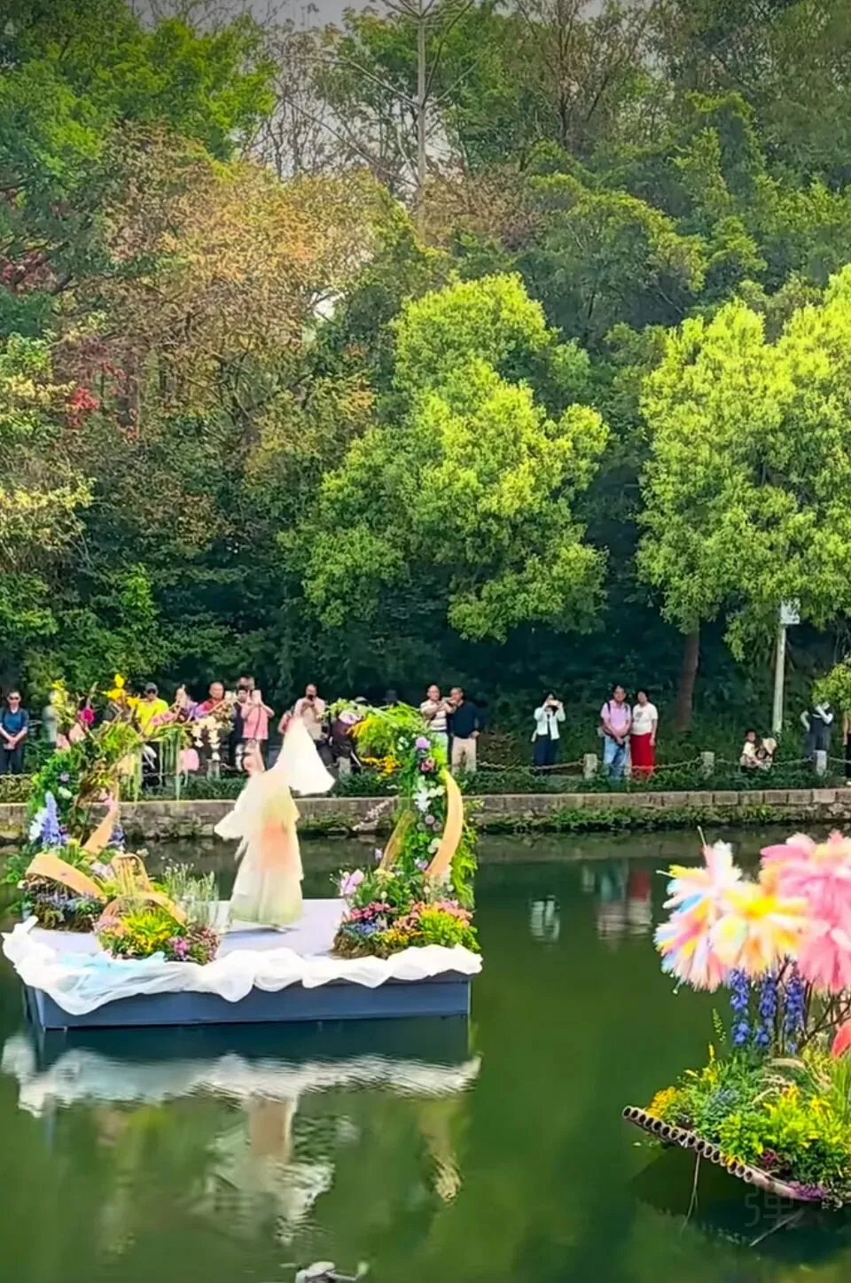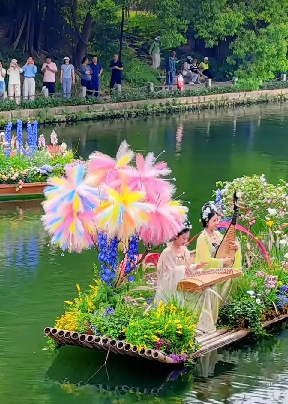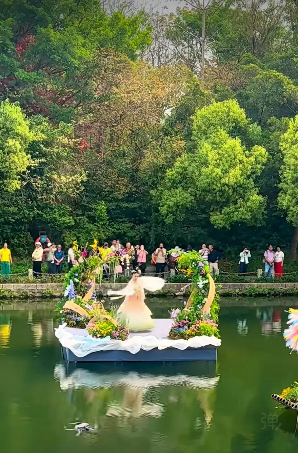 阳光洒在湖面,波光映着曼妙身影,岸边游人驻足凝望,花香裹着乐声,满眼皆是春日温柔。一曲作罢,掌声轻起,这场湖上雅韵,成了花展里最灵动的风景。