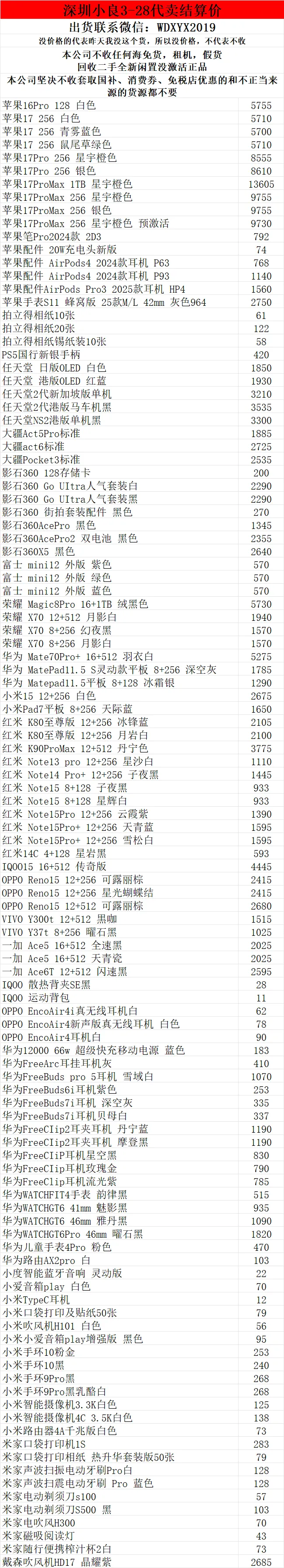 >深圳小良2026.3.28电子产品代卖结算价(美妆价格小程序查看)