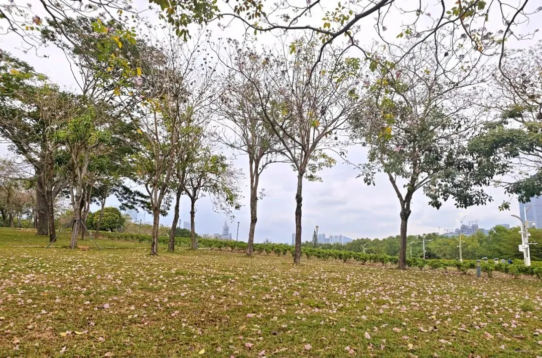 但耐不住弟弟要继续往前,直奔宝安的起点。从太子湾VILLA潮汐广场之后到宝安欢乐港湾那段路,是真的不太好骑。红绿灯多,蛇口海关附近还有超多大货车,有一段很长的硬化路,颠得屁股疼。怪不得一过太子湾,骑行的人少了九成。只能跟着绿道指引往前走,隔好远才能看到一两个骑友。不过也有几段路挺宽的,路两旁种满了紫荆花,花瓣落了一地,特别浪漫。第一次探路,总归是带着好奇和期待,永远不知道前方等着你的是什么。