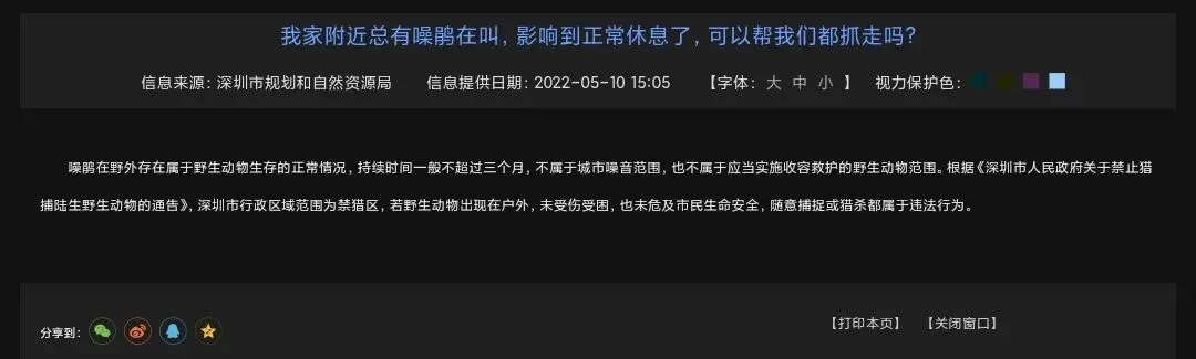 当然了,《中华人民共和国噪声污染防治法》是指在工业生产、建筑施工、交通运输和社会生活中产生的干扰周围生活环境的声音。从法理上来说躁鹃叫声不属于噪声治理范围,但客观上会给备考造成一定影响。这一点从2022年深圳市政府的回应(图2)中也能看出。