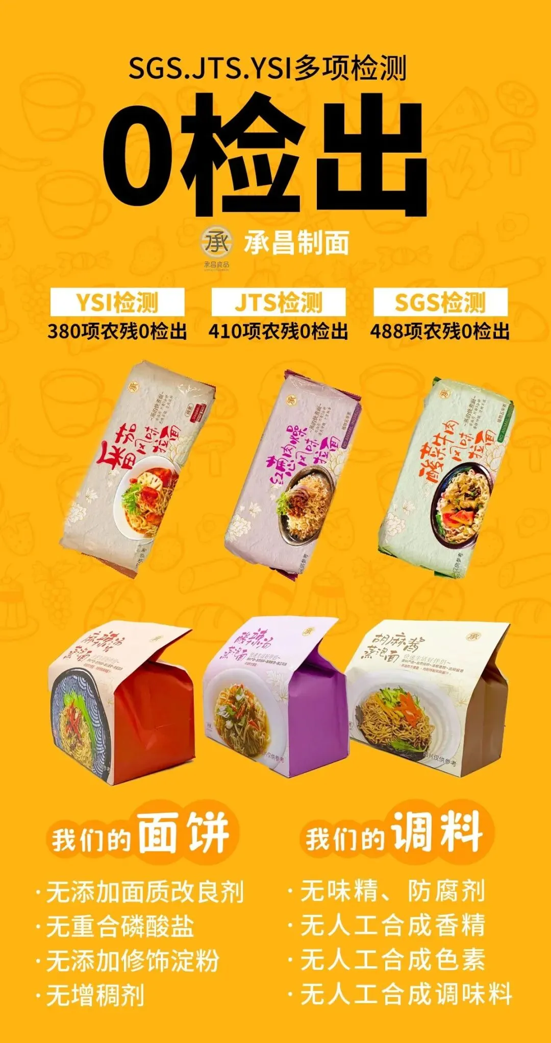 台湾承昌面厂已有50年的历史,秉持着“自己不吃的东西,绝对不卖给别人”。从面饼到调料都是遵循健康食材原则,配料表干净,每一种食材都可追溯,从种植开始严格监管,定期农残检测,保证食材的安全健康,每一种食材都有检测报告。面饼采用高温蒸煮取代油炸,吃起来不会有油腻感,满口面香,久吃不腻。通过8道工序反复碾压,达到面条口感Q弹。