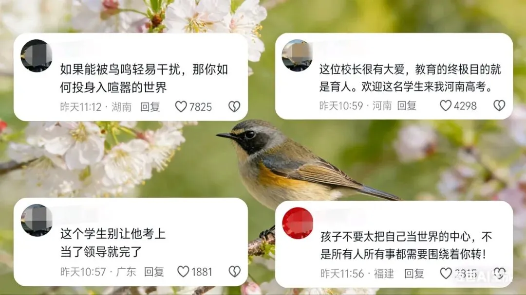 鸟鸣吵,你可以戴个静音耳塞,可以调整自己的学习状态,可以把它当成自然的白噪音,而不是举着“备考”的大旗,让一只鸟儿无家可归。