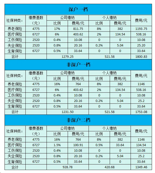 非深户二档:五险合计每月缴费1349.46元,医保部分按6727元基数的2%缴纳,即134.54元
